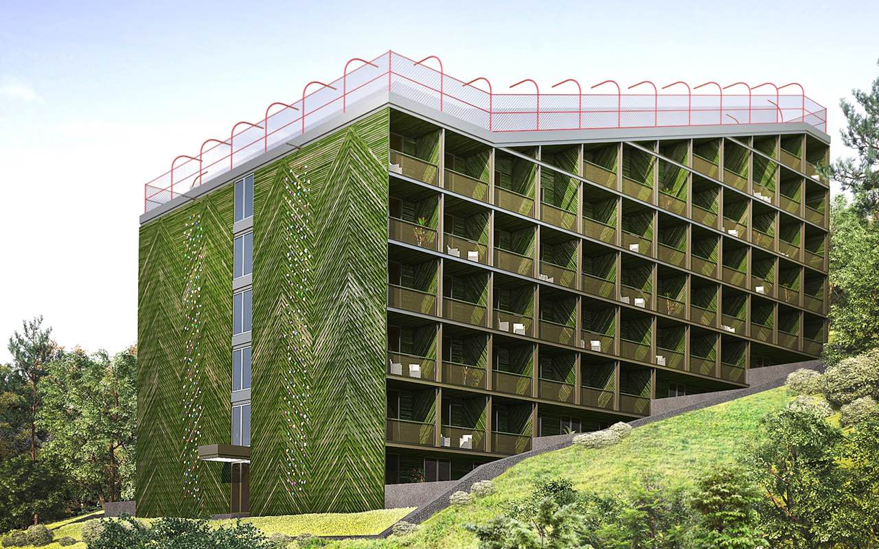 The Dux Development’s roof will offer year-round skiing on a 102 metre long slope that continues down the upper six floors to end two floors above ground level in the eight storey development. A climbing wall is also planned for the side of the building.